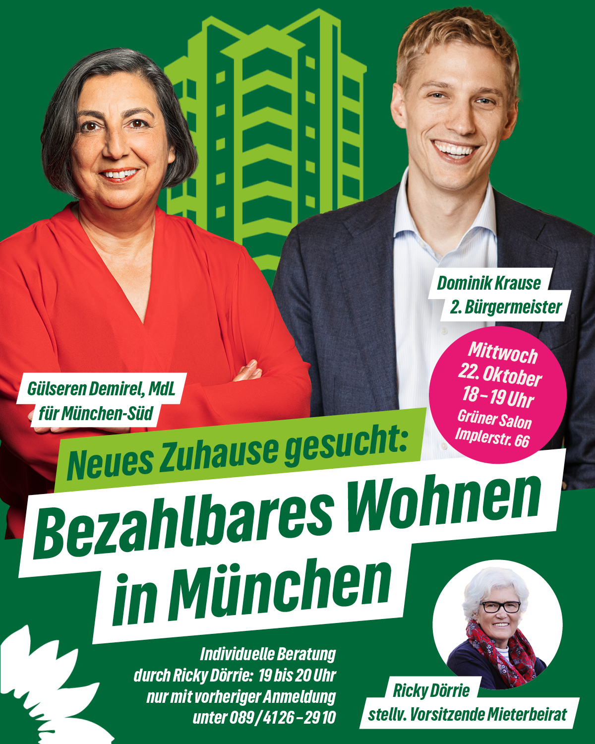 Bezahlbarer Wohnraum bleibt eine der drängendsten sozialen Fragen unserer Stadt. Viele Münchner*innen suchen verzweifelt nach einer Wohnung oder kämpfen mit steigenden Mieten. Darüber spricht Gülseren Demirel, MdL , gemeinsam mit Dominik Krause, 2. Bürgermeister der Stadt München, und Ricky Dörrie, stellv. Vorsitzende des Mieterbeirats der LHM. Mittwoch, 22. Oktober 2025 in der Implerstraße 66 (U-Bahn…